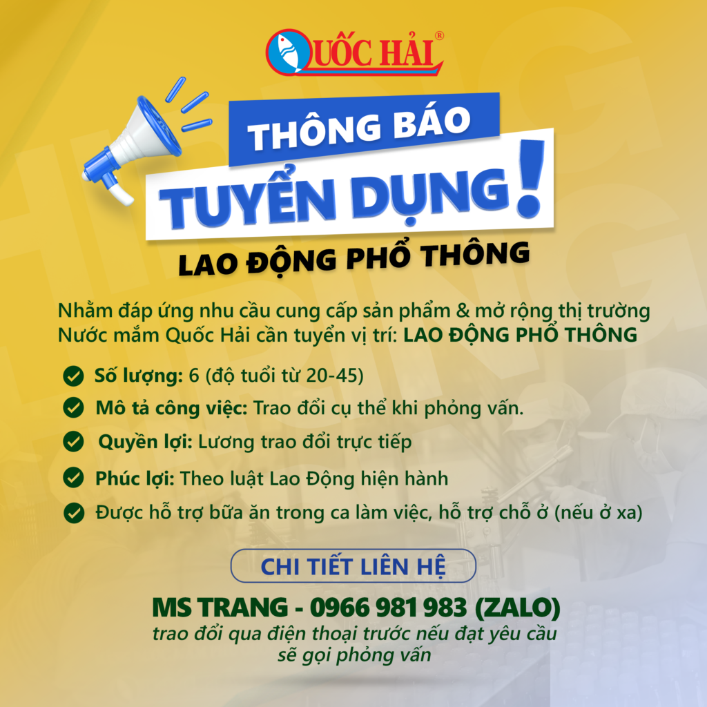 Nhằm đáp ứng nhu cầu cung cấp sản phẩm & mở rộng thị trường Nước mắm Quốc Hải cần tuyển vị trí: LAO ĐỘNG PHỔ THÔNG